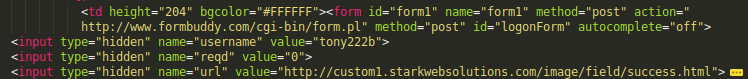 By the way you can observe the field ‘USERNAME’, that you can find filled in the source code with the value: ‘tony222b‘. Rationally it should be the scammer’s Formbuddy.com login account.