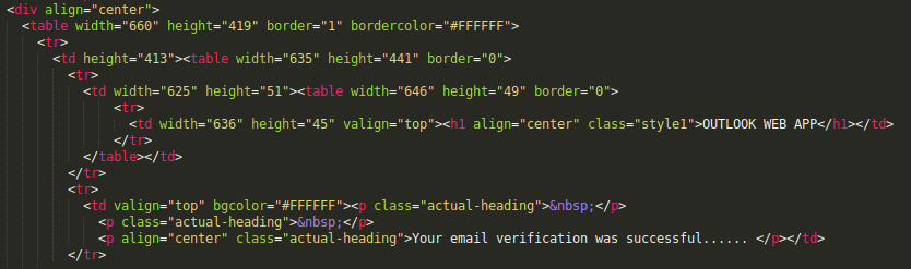 The string ‘Outlook Web App‘ can be found in the phishing kit source retrieved, in the ‘success.html’ file:
