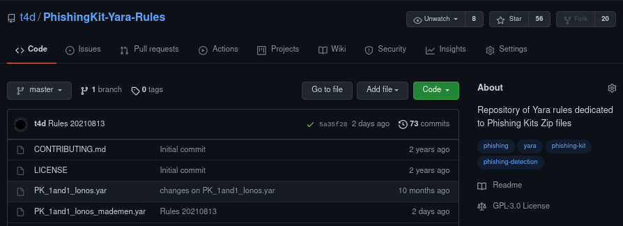 As a reminder, the PhishingKit-Yara-Rules project is a free and open source project which provides several dozen phishing kit detection rules contained in zip archives. You can find these rules on GitHub: https://github.com/t4d/PhishingKit-Yara-Rules
