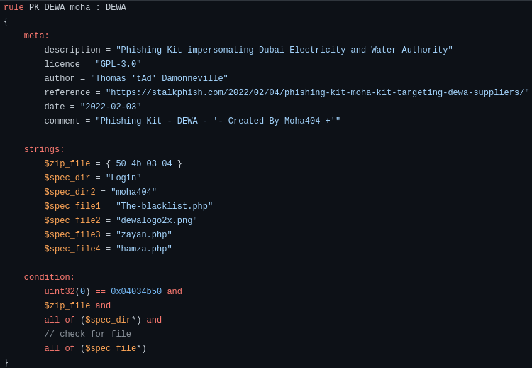 For the phishing kit zip file detection and triage you can use our dedicated Yara rule we published on our GitHub repository: https://github.com/t4d/PhishingKit-Yara-Rules/blob/master/PK_DEWA_moha.yar