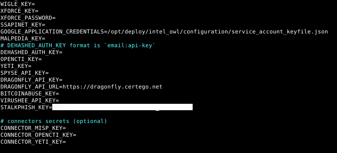 In order to take advantage of the Stalkphish API, it is necessary to enter your Stalkphish’s API key in the Intel Owl configuration file:
