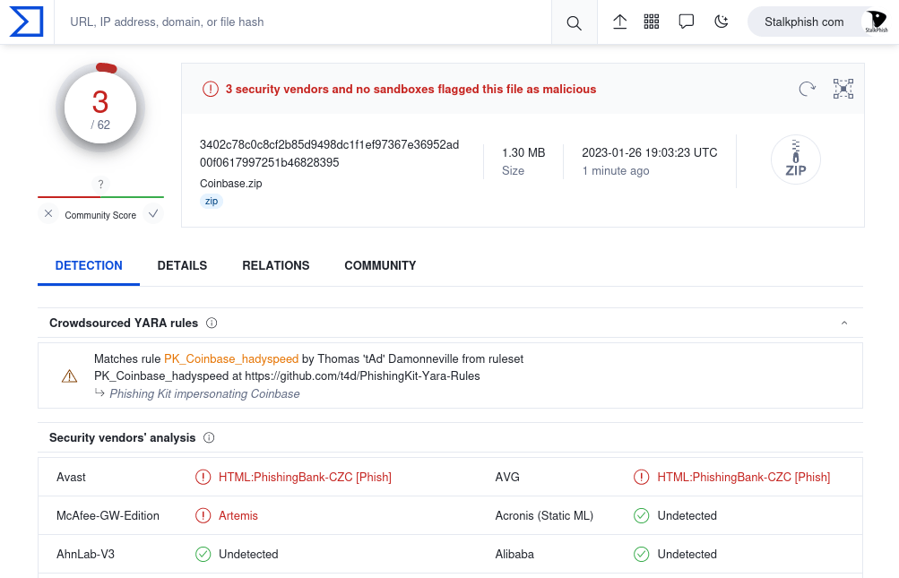The VirusTotal analysis give the ZIP file a 2/64 score, but you can see the result of the PhishingKit Yara Rule which allows for a better contextualization of the threat: