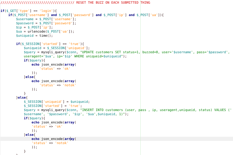 … then the data (login, password, user-agent, IP address, uniqueid) are entered in the MySQL database. By the way, observe the comment appearing in the file/action.php page and which concerns the ‘buzz‘, we will come back to it: