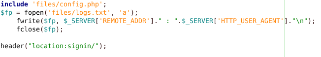 Looking at the first index.php file – the first page you launch when you connect to the phishing page – we can see that the connections are logged (IP address and user-agent) in a text file at the root of the kit.