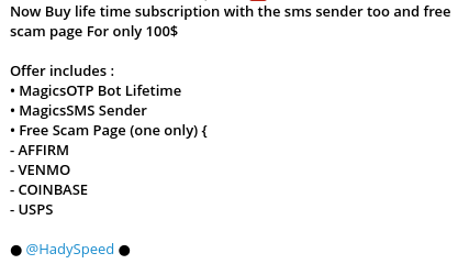 Several kits were deployed between December 27 and 28 on this same domain name according to Stalkphish.io, 2 Coinbase kits as well as an Affirm kit. All these phishing kits are produced by the same developer: HadySpeed. However, this does not mean that this is the scammer operating the campaign, as the scammer may have purchased the kits as well as the smishing tool that HadySpeed sells: